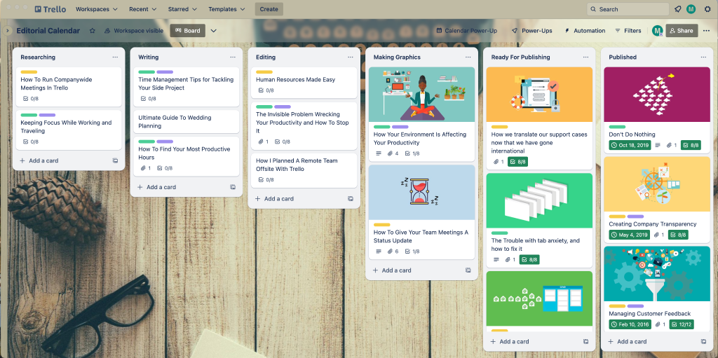 In this editorial calendar template from Trello, the creators organize the content flow by phase of work, including “Researching,” “Writing,” and “Editing.”