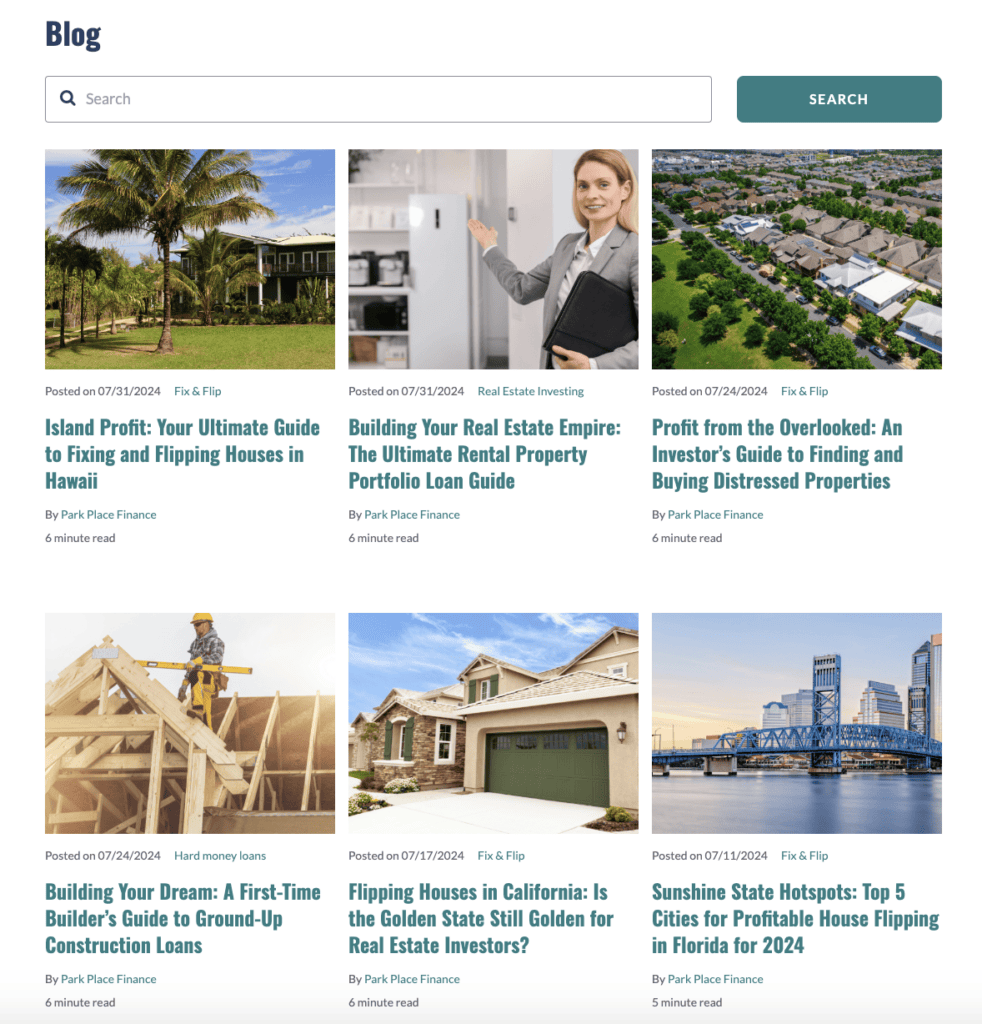 Park Place Finance’s blog contains numerous topics on real estate investing, including specific fix-and-flip insights, tips for finding distressed properties, and how to build a rental property portfolio.