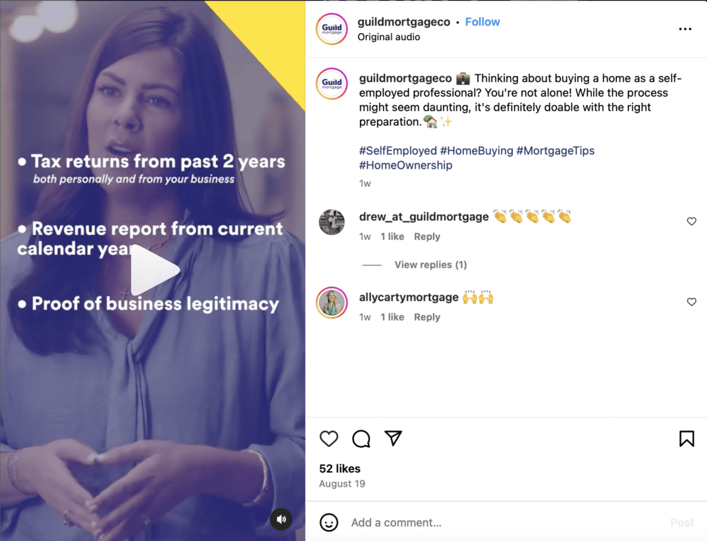 Guild Mortgage shared a short video Reel to Instagram explaining how the homebuying process works for self-employed borrowers.