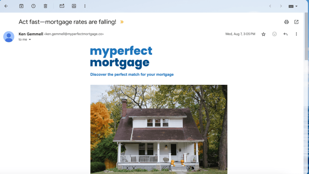 MyPerfectMortgage.com recently sent an email encouraging its target audience to take action due to falling rates, including purchasing a home or refinancing.
