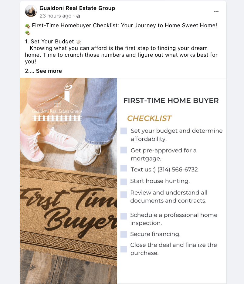 Gualdoni Real Estate Group shared a handy checklist for first-time buyers on Facebook, with clear steps and a strong call to action.