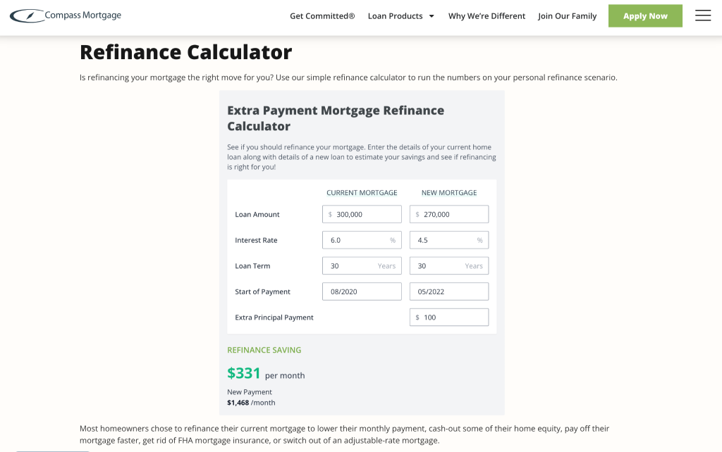 Interactive tools like mortgage calculators are popular because they give prospects a quick idea of what they can afford, how much they’ll have to pay, or how much they could save by refinancing.